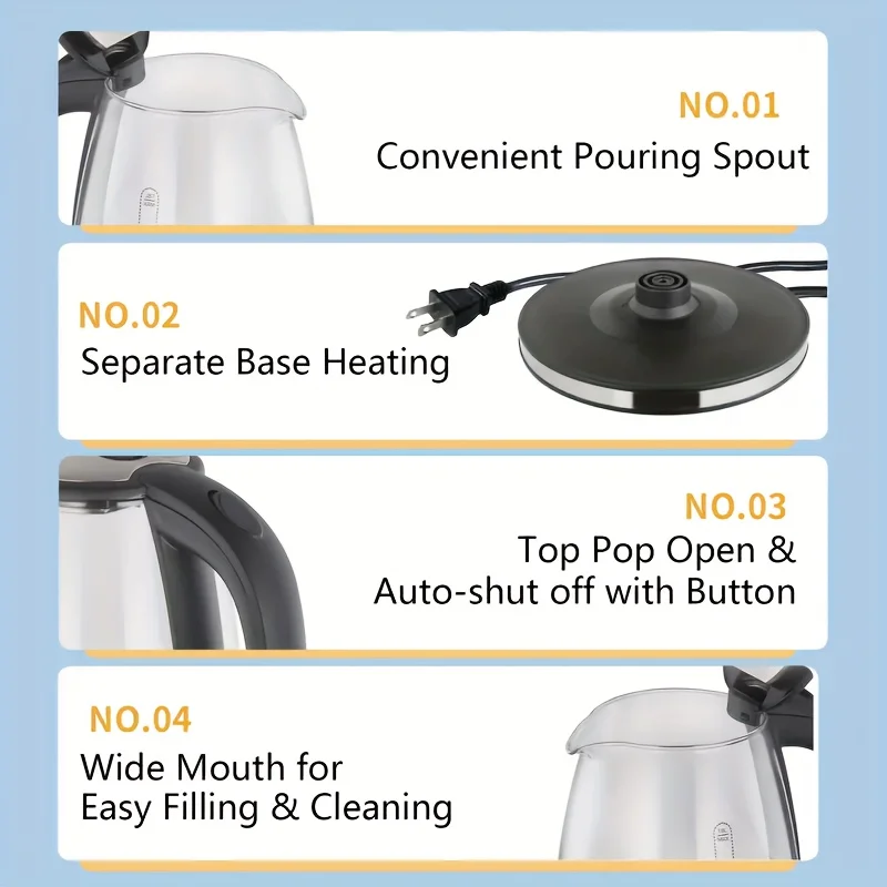 36. 2L Glass Electric Kettle (67.6oz) – 1000W Fast Boiling with Anti-Dry Burn Tech for Kitchen & Dining